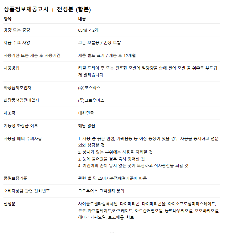 그로우어스 데미지 테라피 헤어 오일 65ml+65ml