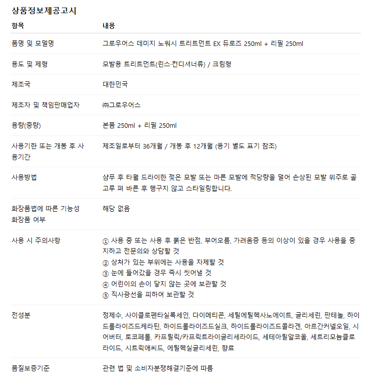 HOME > 화장품/미용 > 헤드케어 > 샴푸 > 그로우어스 데미지 노워시 트리트먼트 EX 듀로즈 250ml+리필250ml